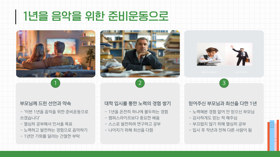 대학에 붙어서 행복한 캠퍼스라이프를 즐기고 싶은 것도 큰데, 전 지금 그것보다 1년을 온전히 하나에 몰두해 쏟아붇는 경험이 더 필요한 것 같습니다. 1년만 기회를 주십쇼”