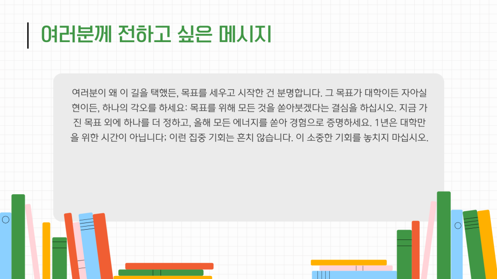 여러분이 지금 가지고 있는 목표 말고도 하나의 목표를 추가하세요, 올해 여러분의 모든 걸 갈아넣으세요. 그리고 그 경험으로 뭐든 해내세요. 여러분의 1년은 대학을 위해서만 존재하지 않습니다. 1년간 하나의 목표만 보고 미친듯이 노력할 기회는 많지 않습니다. 이 천금 같은 기회를 놓치지 마시길 바랍니다.