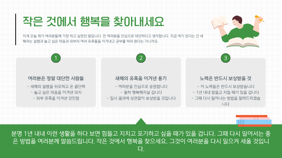입시 결과에 상관없이 어떤 방법으로든 이 노력들을 보상받으실 겁니다. 하지만, 분명 1년 내내 이런 생활을 하다 보면, 힘들고 지치고 포기하고싶을 때가 있을 겁니다. 그 때 다시 일어서는 좋은 방법을 여러분께 하나 말씀드리고 마무리하겠습니다.