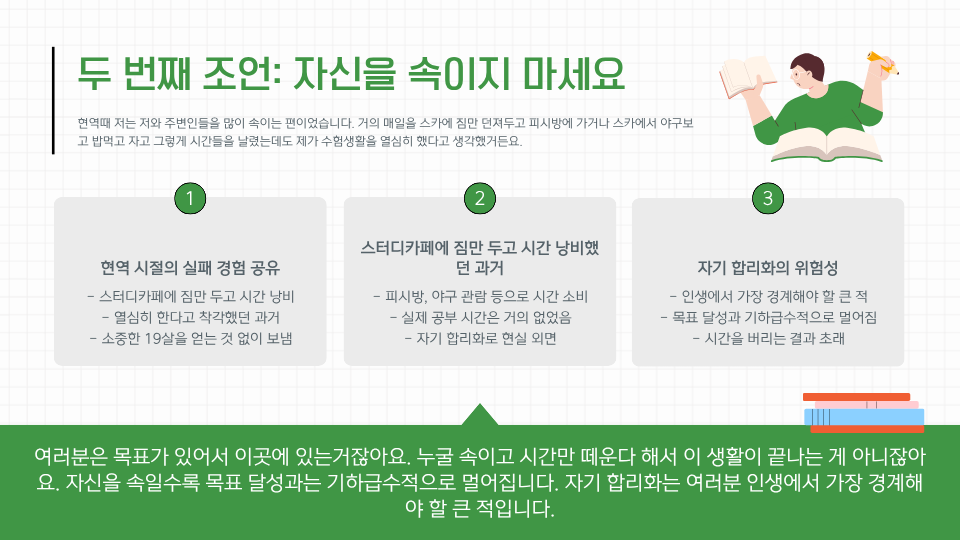 그렇게 1년을 보낸다면, 진짜 그냥 시간을 버린 꼴 아닐까 싶어요. 정말 조심하시기 바랍니다. 자기 합리화는 여러분 인생에서 가장 경계해야 할 큰 적입니다.
